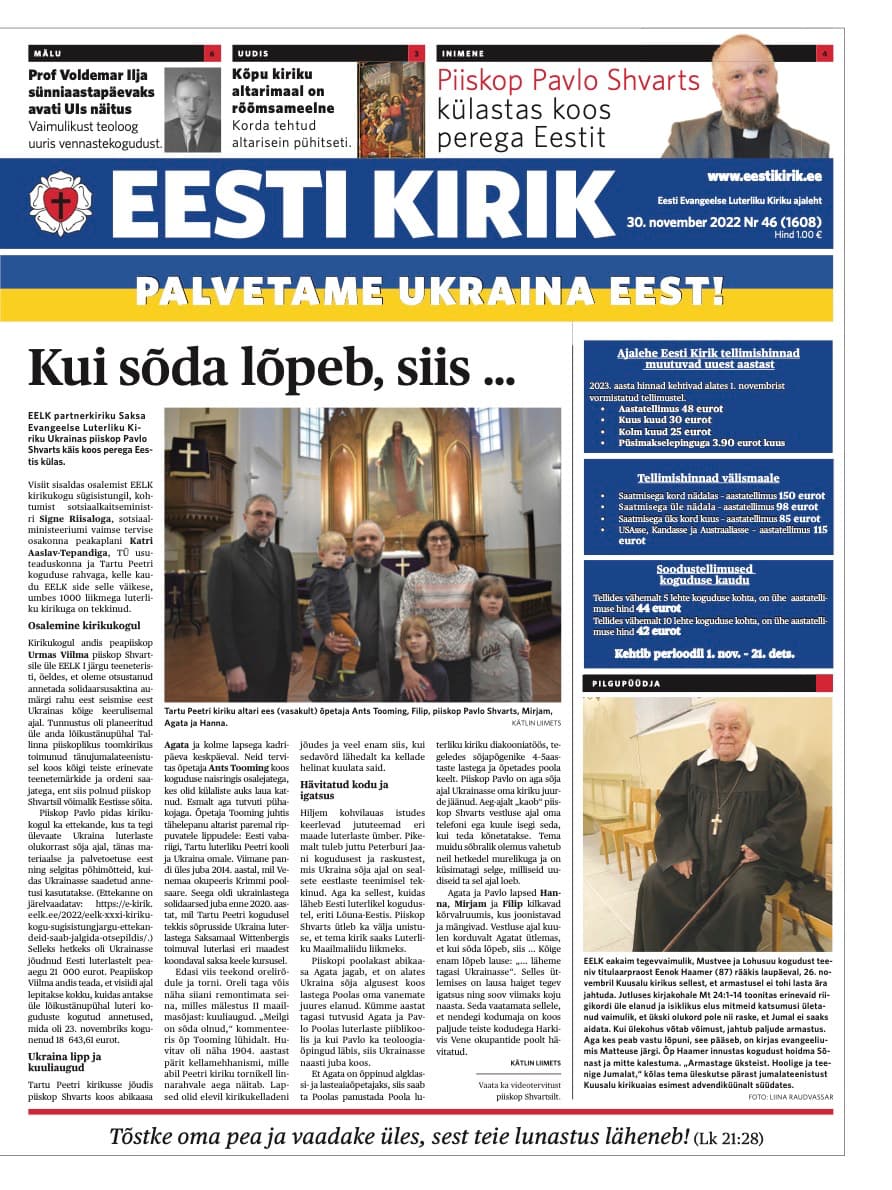 EELK partnerkiriku Saksa Evangeelse Luterliku Kiriku Ukrainas piiskop Pavlo Shvarts külastas koos perega Eestit. Visiit sisaldas osalemist EELK kirikukogu sügisistungil, kus peapiiskop Urmas Viilma andis talle üle EELK teeneteristi I järgu ordeni. Piiskop külastas ka Tartut, kus ta külastas Peetri kirikut, ülikooli usuteaduskonda ning andis ajalehele Eesti Kirik intervjuu.