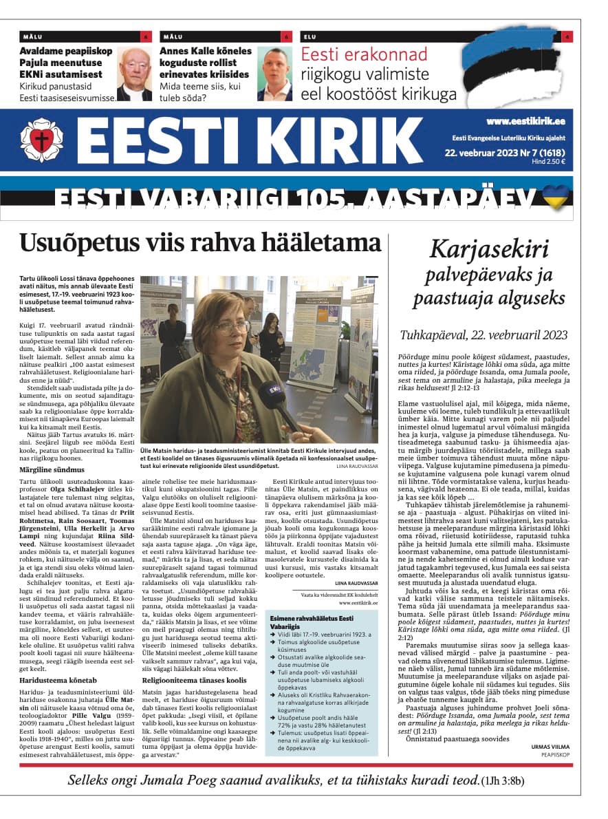 Ülevaade sellest, mida pakub oma lugejatele ajaleht Eesti Kirik tuhkapäeval, 22. veebruaril Issanda aastal 2023
