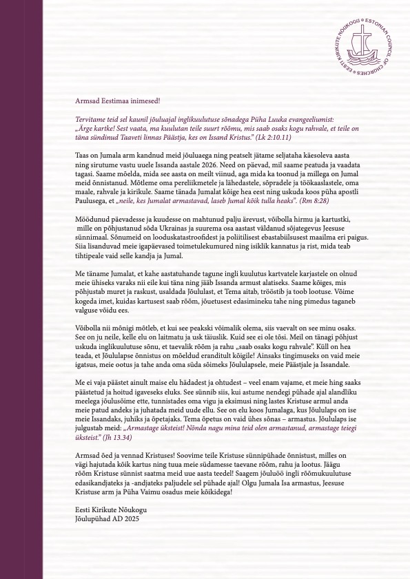 Taas on Jumala arm kandnud meid jõuluaega ning peatselt jätame seljataha käesoleva aasta ning sirutume vastu uuele Issanda aastale 2026. Need on päevad, mil saame peatuda ja vaadata tagasi. Saame mõelda, mida see aasta on meilt viinud, aga mida ka toonud ja millega on Jumal meid õnnistanud. Mõtleme oma pereliikmetele ja lähedastele, sõpradele ja töökaaslastele, oma maale, rahvale ja kirikule. Saame tänada Jumalat kõige hea eest ning uskuda koos püha apostli Paulusega, et „neile, kes Jumalat armastavad, laseb Jumal kõik tulla heaks“. (Rm 8:28)