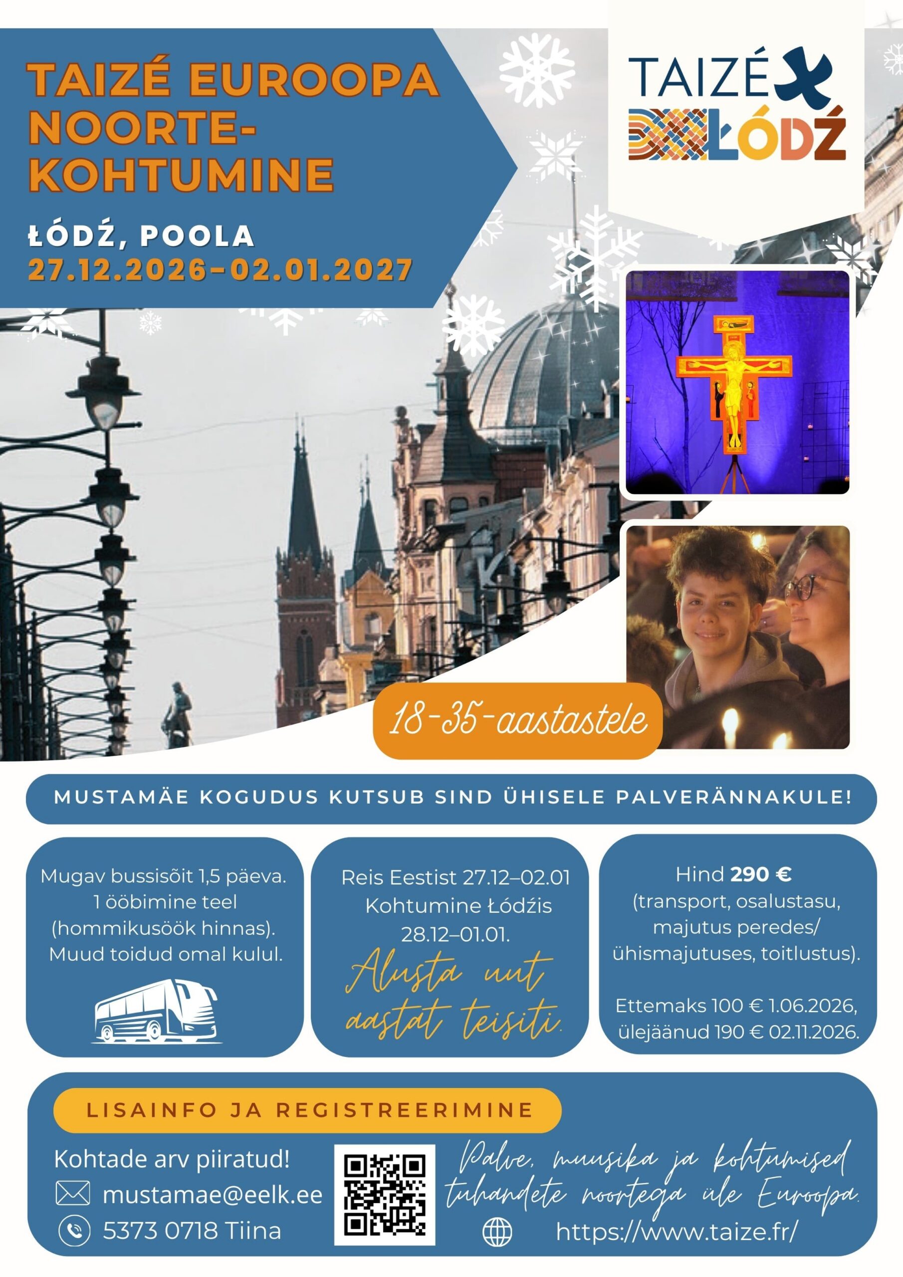 18–35-aastasi noori kutsutakse osalema Taizé Euroopa noortekohtumisel, mis toimub tänavu 28. detsembrist 2026 kuni 1. jaanuarini 2027 Poolas Łódźi linnas. Eestist sõidetakse kohtumisele ühiselt bussiga ning teekond kestab 27. detsembrist 2026 kuni 2. jaanuarini 2027. Reisi korraldab Mustamäe kogudus.