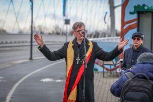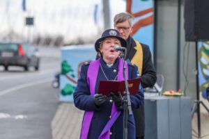 Kaanefotol: Pärnu linnapea Kristel Voltenberg kõnelemas linna vaimulike esindajate ja Rääma silla taustal (foto: Toomas Nigola)
