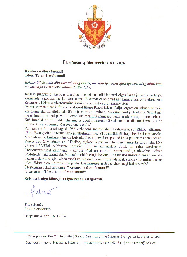 Tiit Salumäe on piiskop emeeritus, kes on aastakümnete jooksul teeninud kirikut nii koguduseõpetaja, piiskopi kui kirikliku kõneisikuna. Tema tänavune ülestõusmispühade tervitus on kirjutatud Haapsalus 4. aprillil AD 2026.