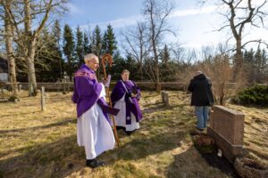 Enne jumalateenistust asetati koos koguduse õpetaja ja Karuse õpetaja Meelis Malkiga küünlad kunagise koguduse õpetaja Arvet Pauli ja tema abikaasa hauale, kus peeti hingepalve. Veel talvekülma õhkavas karges kirikus toimunud jumalateenistusel mängis orelil Lia Salumäe.