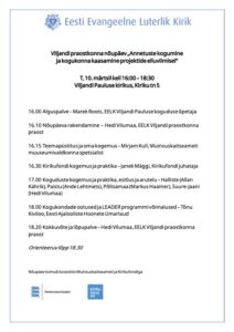 Päeva teises pooles kõneleb Eesti Ajalooliste Hoonete Ümarlaua esindaja Tõnu Kiviloo kogukondade ootustest ning LEADER programmi võimalustest kirikute restaureerimisel.