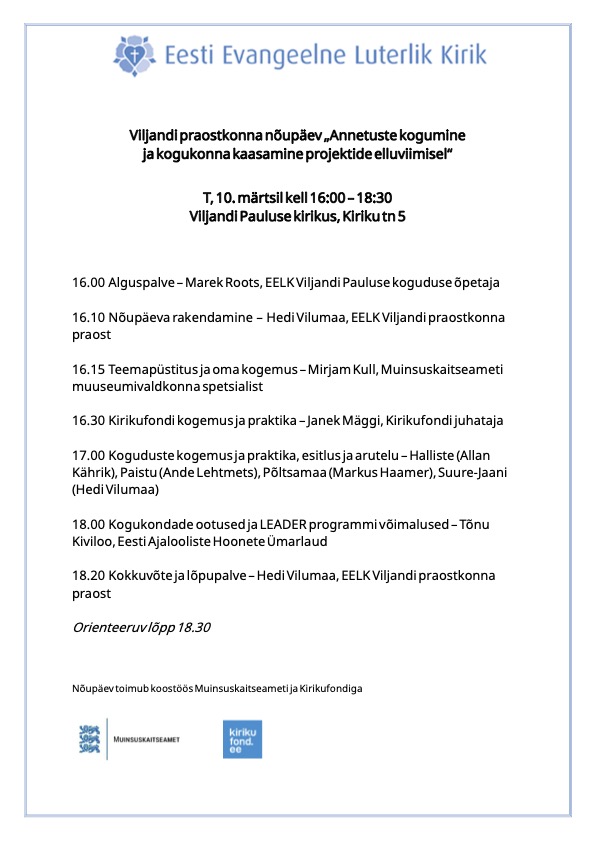 Viljandi praostkond korraldab teisipäeval, 10. märtsil kell 16.00–18.30 Viljandi Pauluse kirikus (Kiriku tn 5) nõupäeva „Annetuste kogumine ja kogukonna kaasamine projektide elluviimisel”. Sündmuse eesmärk on tutvustada kogudustele erinevaid rahastamisvõimalusi ja jagada praktilisi kogemusi projektide elluviimisel kogukondade kaasamise kaudu.