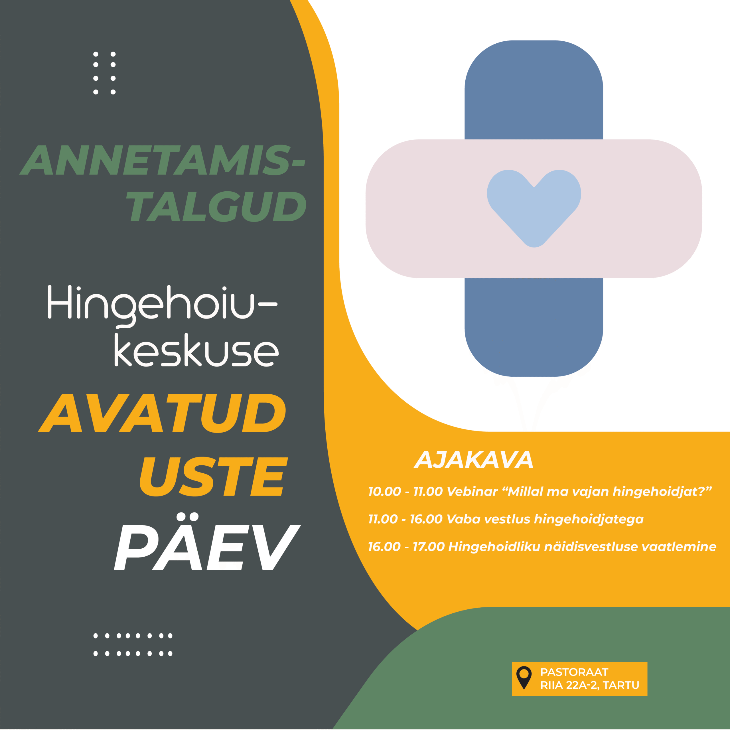 Päev algab vebinariga, mida on võimalik jälgida nii veebis kui osaleda Pastoraadis kohapeal. Hingehoidjad Naatan Haamer, Raili Hollo ja Kaili Särg tutvustavad hingehoidutöö olemust ning selgitavad, millistes olukordades võib hingehoidja tugi olla vajalik.